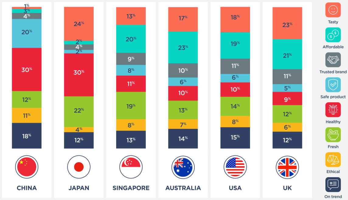 While “affordable” and “tasty” are major factors for shoppers elsewhere, in China they just creep onto the chart. Instead “healthy” is of huge importance, followed by “safe” and “on trend”.