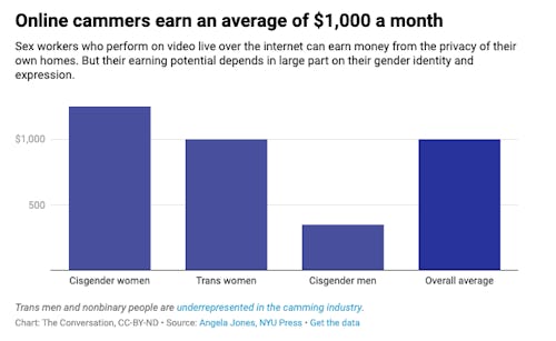 Most of the top earners are from the U.S., and spent years building a brand. But most cam models work part-time, and median earnings were $1,000 a month overall, with trans women right at that average, but cisgender women $1,250 and cisgender men $350.