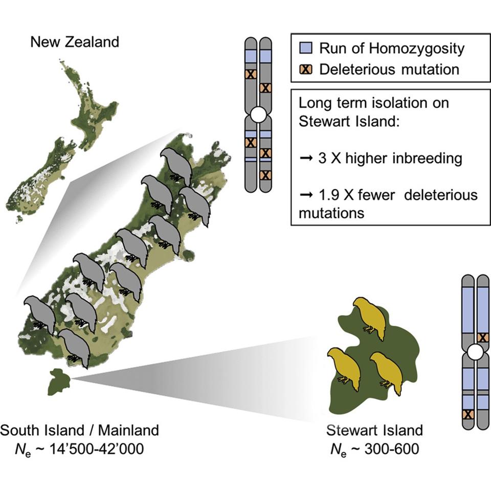 This long period of isolation, combined with the severe decline of the Stewart Island population during the past 150 years could have further decreased the genetic diversity of the remaining kākāpō. Dr Dussex and his collaborators investigated this possibility and found that large portions of Stewart Island kākāpō genomes were identical due to recent mating between closely related individuals, probably during the past ten generations. Dr Dussex and his collaborators then compared the genomes from the mainland kākāpō and the Stewart Island kākāpō, and were surprised to find that the Stewart Island birds have around half as many harmful mutations as those that lived on the mainland more than a hundred years ago.