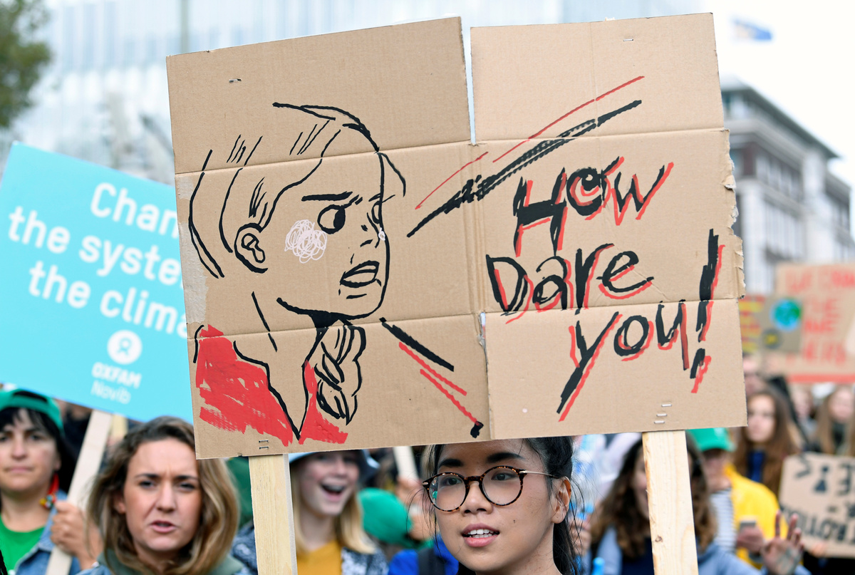 A participant holds a drawing depicting Swedish environmental activist Greta Thunberg during a protest march to call for action against climate change, in The Hague, Netherlands September 27, 2019. REUTERS/Piroschka van de Wouw