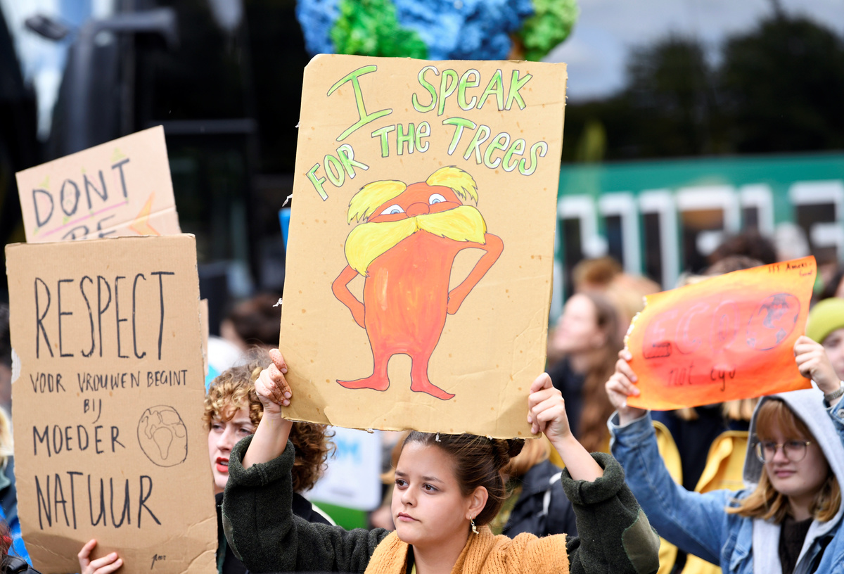 A participant holds a drawing depicting the Lorax during a protest march to call for action against climate change, in The Hague, Netherlands September 27, 2019. REUTERS/Piroschka van de Wouw