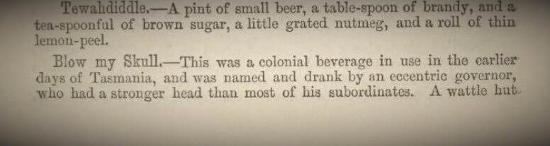 The 1864 English and Australian Cookery Book lists the recipe for Davey's Blow My Skull cocktail, "named and drank by an eccentric governor, who had a stronger head than most of his subordinates".