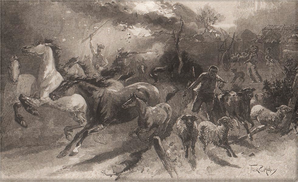 "After a moment's pause he cried out 'black beard against grey beard for a million!" and fired; I slapped at him, and I believe hit him, for he staggered, but rallied again and was clearing the bank between him and me when Pugh ran up and with the butt-end of his firelock knocked him down, jumped after him and battered his brains out just as he was opening a clasp knife to defend himself."