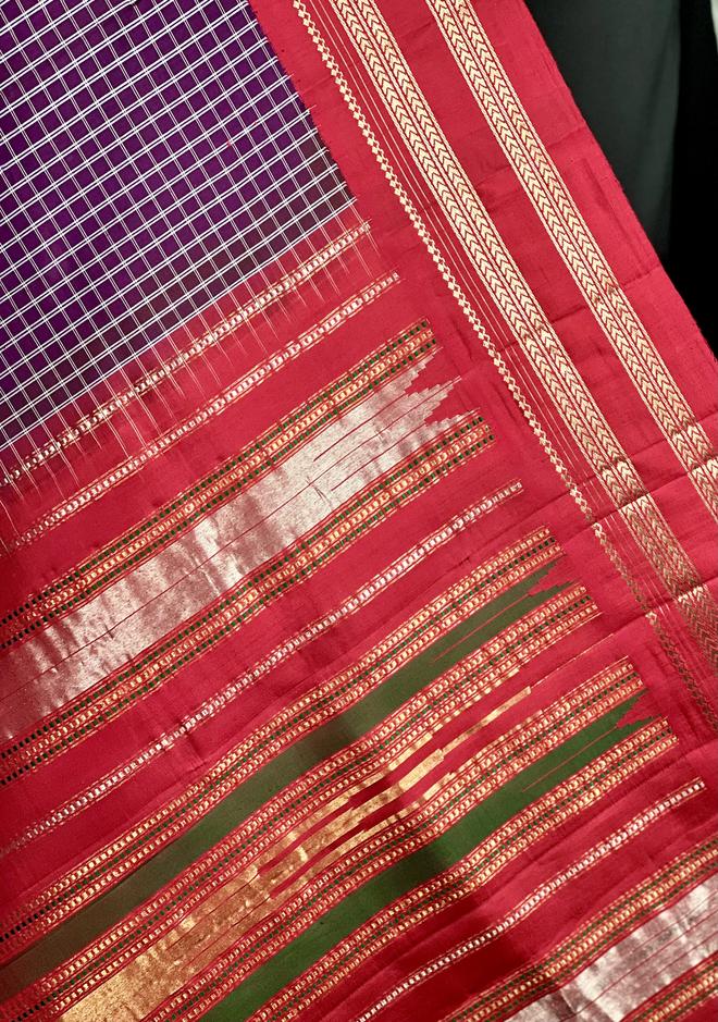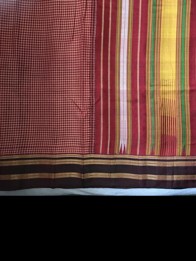 He says it was evident that the sari belonged to the design tradition of ‘Irkal’ or ‘Ilkal’ of North Karnataka, which has a dagger pattern on the border, known as Katyari Kath in Marathi. That design variation on the pallu distinguished it from an Ilkal.