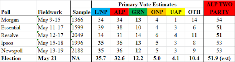 The table below shows the final national polls from all pollsters, and the election results using the ABC’s two party estimate. Poll estimates that were within 1% of the results are in bold.