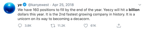 West retains 100 percent ownership of Yeezy, and at the very least the company receiving money intended for small businesses looks questionable. As a whole, the fashion industry is expected to see a loss of revenue between 27 and 30 percent, according to Business of Fashion. That may indeed have spelled trouble for Yeezy without government assistance, but you have to wonder what kind of liquidity the brand has and if it would disqualify it under the terms of Mnuchin's statement.