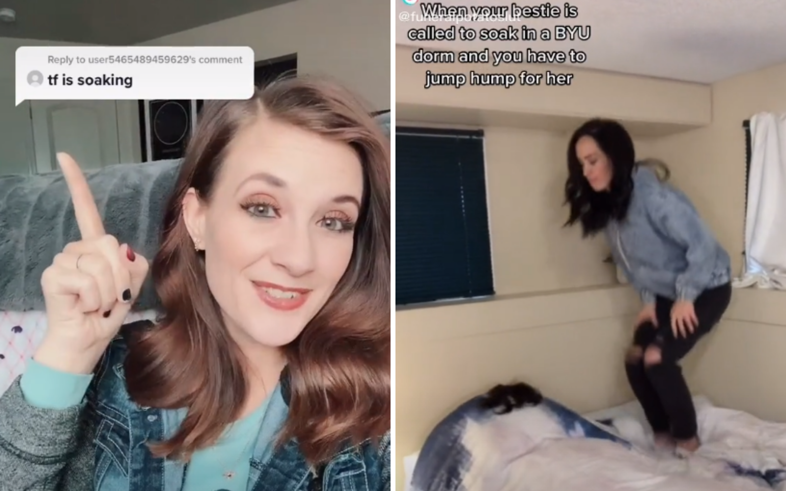 In a video that has been viewed over four million times, TikToker Kathy posted a video of her jumping on a bed beside what looks like a couple under the duvet with on-screen text reading: “When your bestie is called to soak in a BYU dorm and you have to jump hump for her.”
