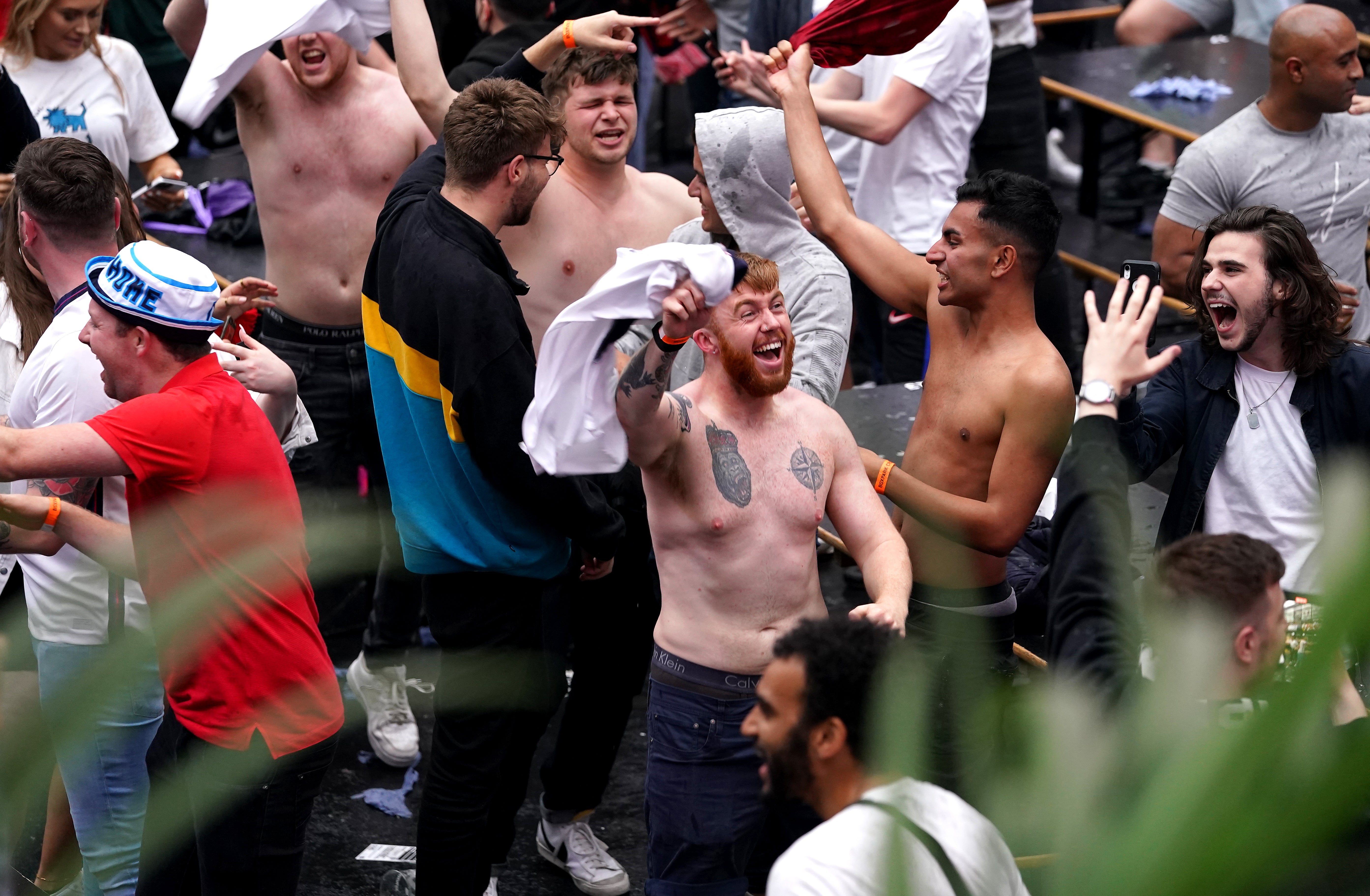 Several also jumped on to the tables while cups filled with drinks were thrown into the air. Others danced around, hugging each other despite protests from security to maintain social distancing.
