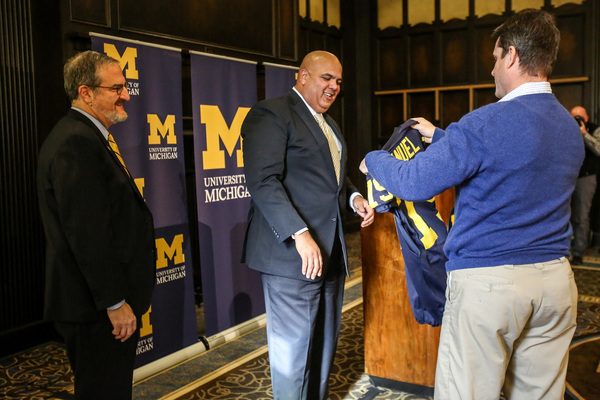 When I asked him what stood out so far during his time as AD, he said, "The day I was announced. The number of e-mails and texts I received to welcome me back to Ann Arbor was a highlight and, Jim presenting me my jersey."