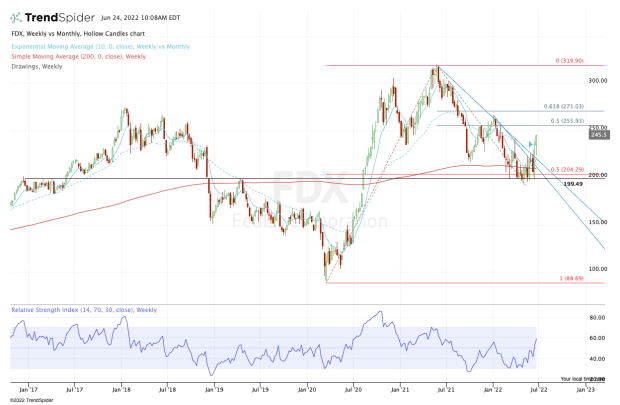 From March through May, FedEx held an important area on the pullback. That zone was the key $200 level, the 50% retracement and the 200-week moving average.
