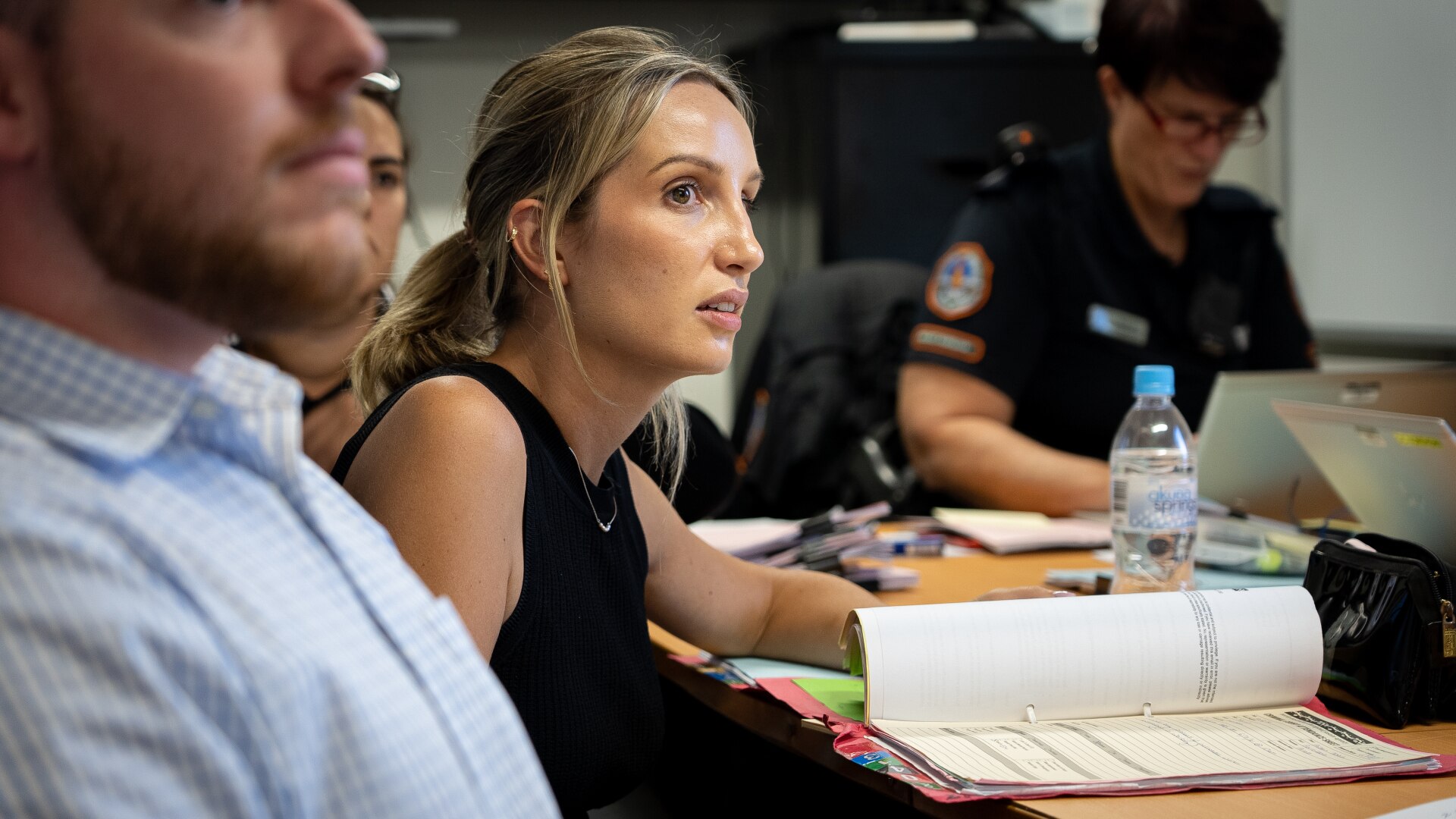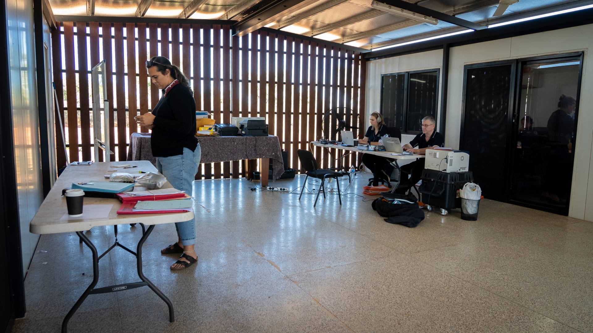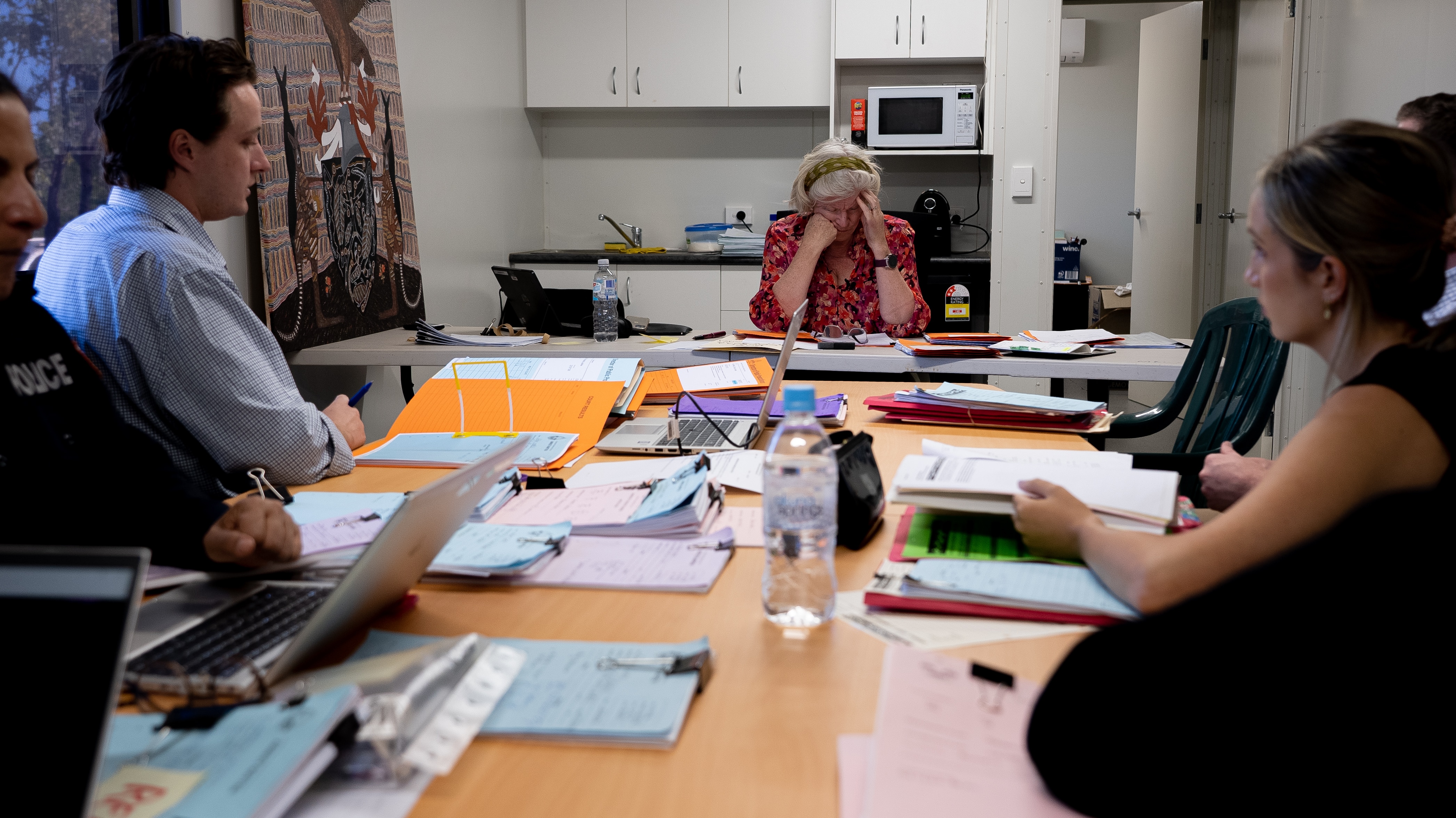 As they take their clients' instructions, the Chief Judge of the Northern Territory Local Court, Elizabeth Morris, helps set up the temporary courtroom she will preside over for the next three days.
