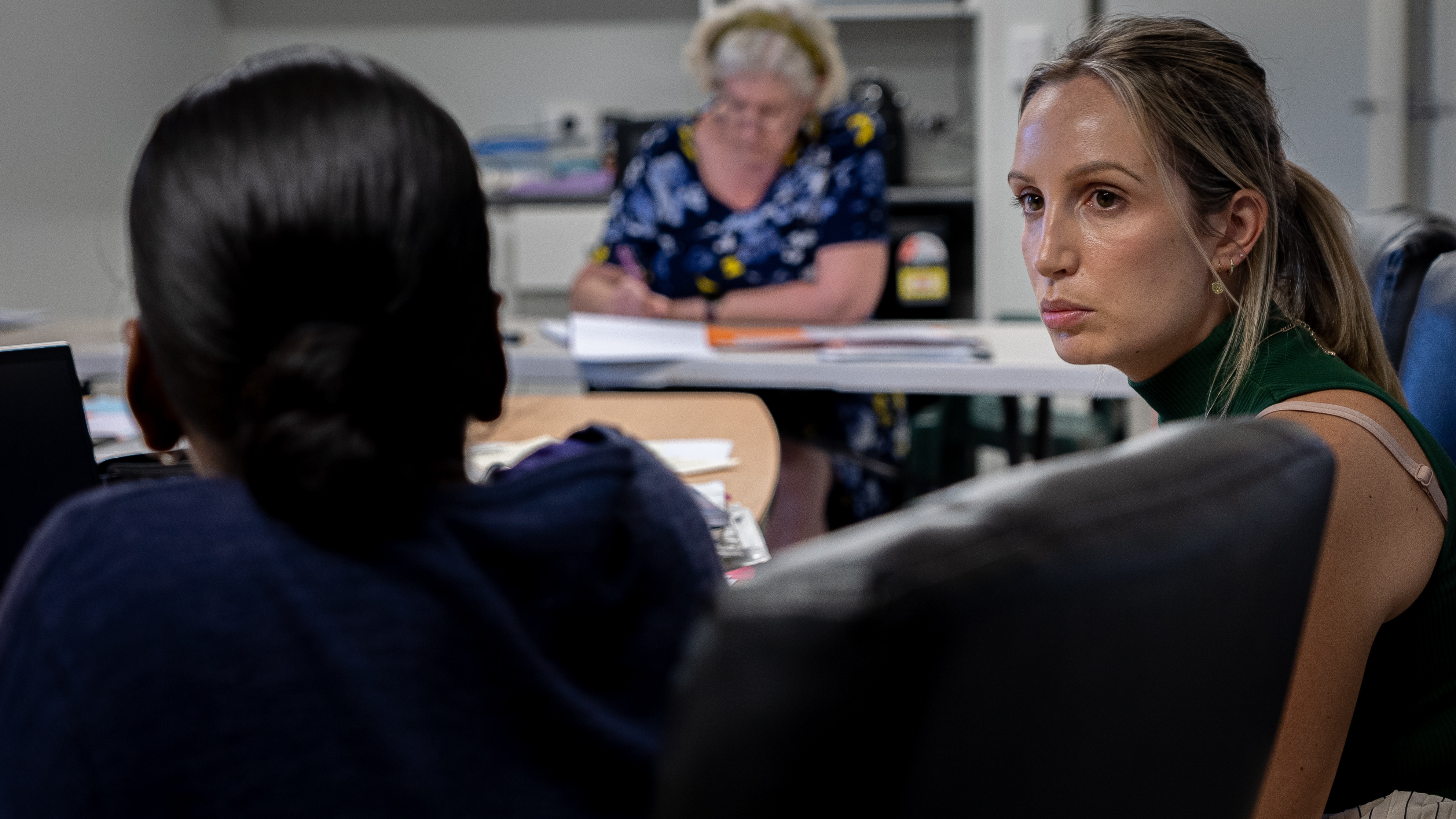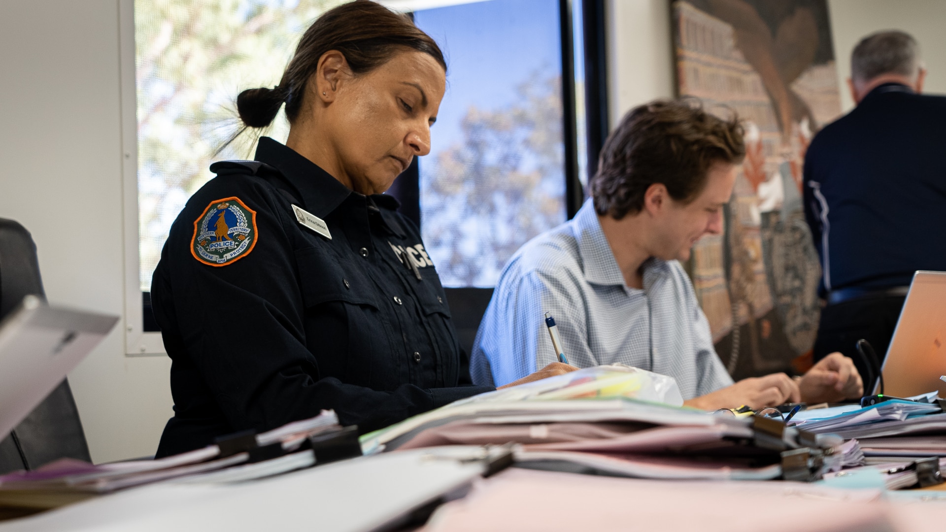 The two North Australian Aboriginal Justice Agency (NAAJA) defence lawyers talk to their clients one-by-one, either in a makeshift office or under a tree outside.