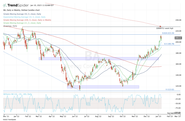 Near $225, Boeing stock faces the 38.2% retracement from the 2020 low to the all-time high.