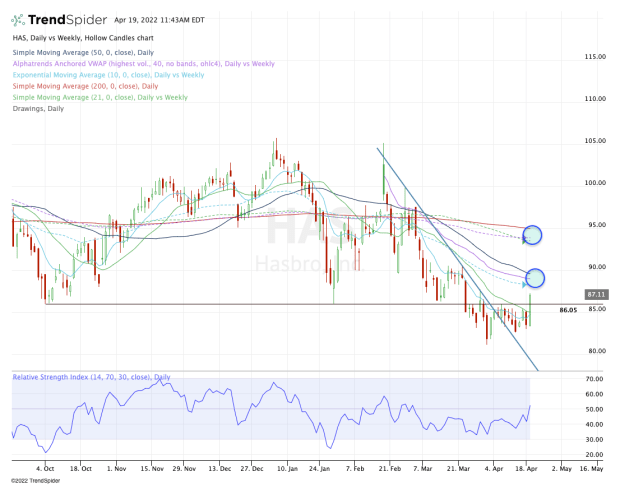 With today’s post-earnings rally, Hasbro stock not only cleared these two key short-term moving averages, but it also reclaimed $86.