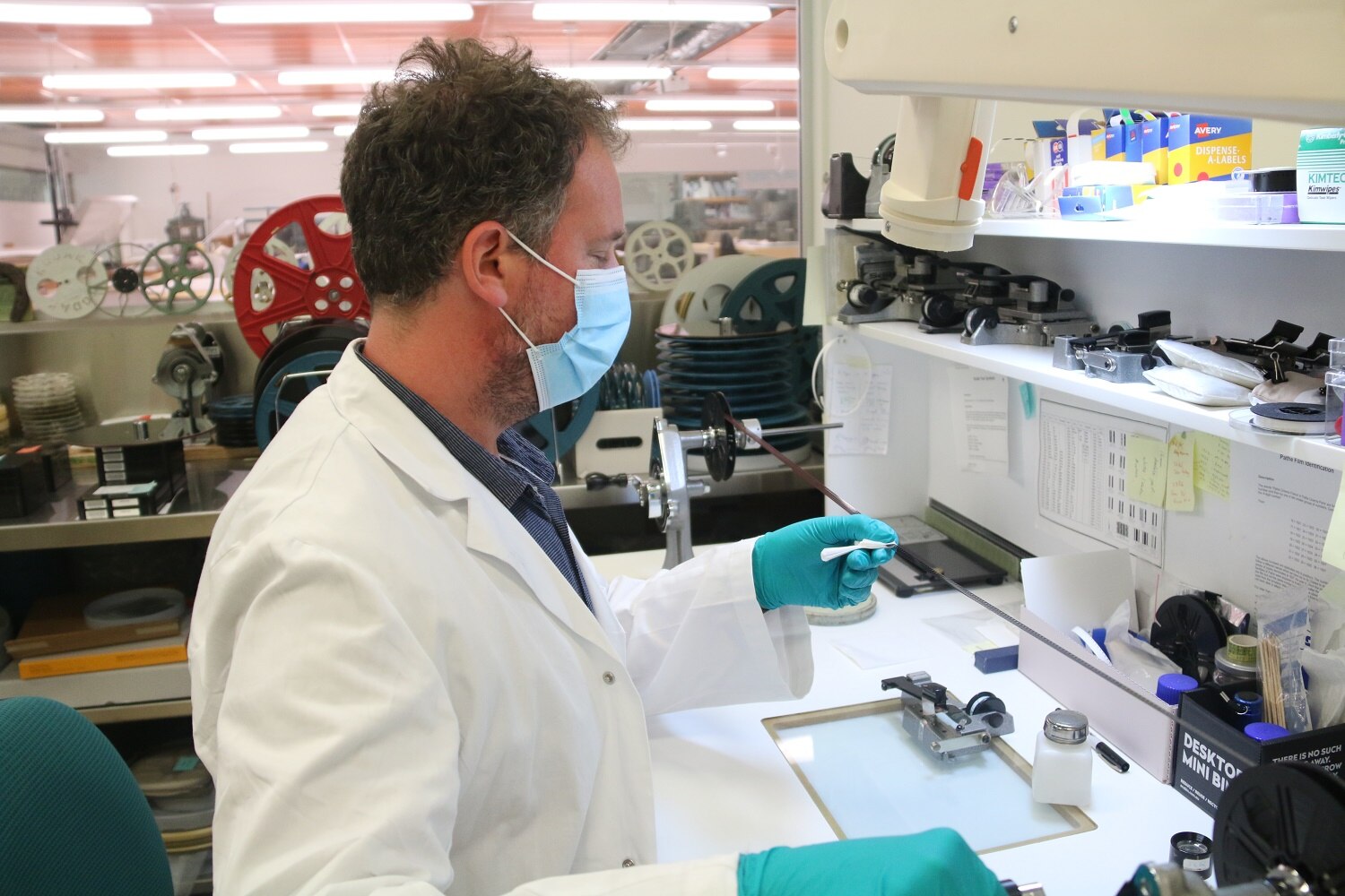 Experts crank each film by hand, using an eye piece to check individual frames for mould, before the item is ready for digitisation.