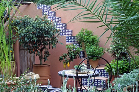 Moroccan riad: Banana palm, papyrus plant, colocasia, Phoenix canariensis (date palm), bougainvillea, oleander, agave.