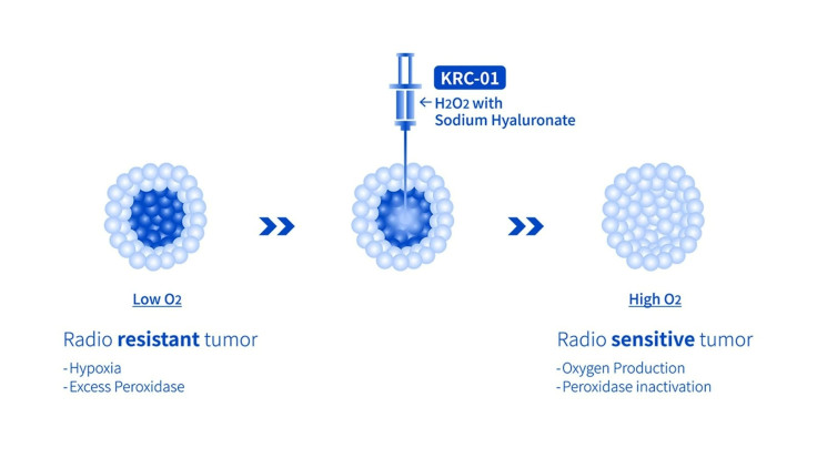 When KRC-01 is injected directly into a tumor shortly before radiation treatment, it temporarily increases oxygen levels inside oxygen-poor tumor regions. It also neutralizes certain enzymes that help tumors maintain low-oxygen conditions. Together, this creates a brief window where radiation can work more effectively.