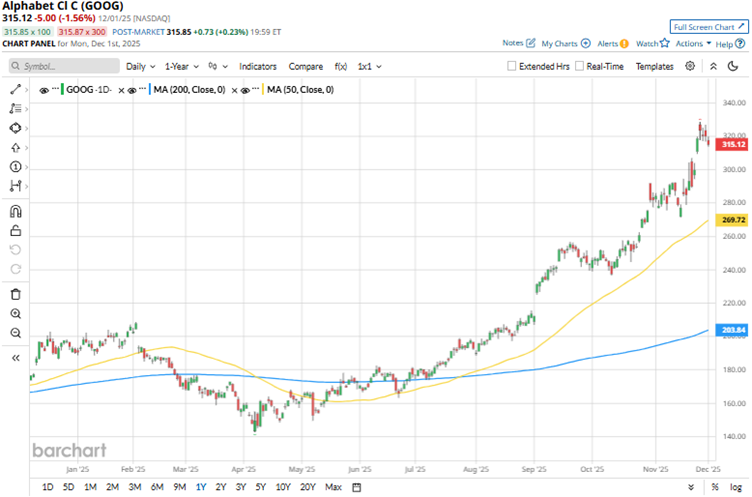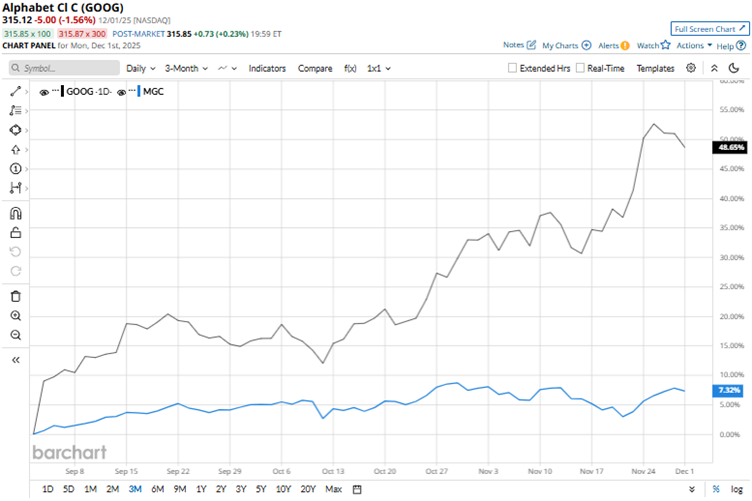 GOOG’s stock reached a 52-week high of $328.67 on Nov. 25, but is down 4.1% from that level. With strong financials and rapid advances in AI, the stock has gained 47.6% over the past three months. In stark contrast, the Vanguard Mega Cap Index Fund (MGC) has gained 6.6% over the same period. So, GOOG is the clear outperformer during this period.