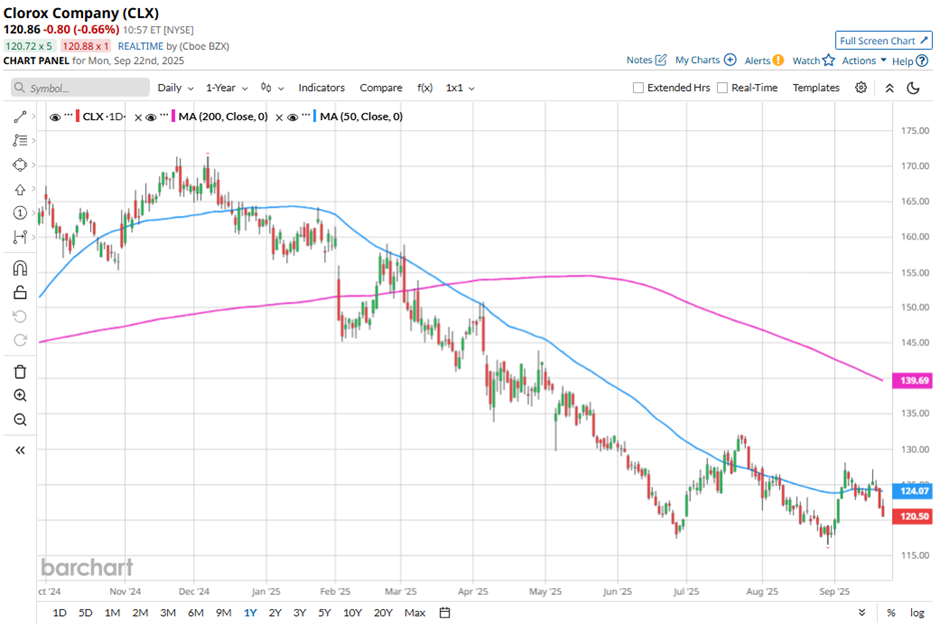 With a market cap of $14.9 billion, The Clorox Company (CLX) is a leading global manufacturer and marketer of consumer and professional products. The company operates through four segments: Health and Wellness; Household; Lifestyle; and International, offering trusted brands such as Clorox, Pine-Sol, Glad, Kingsford, Hidden Valley, Brita, and Burt’s Bees.