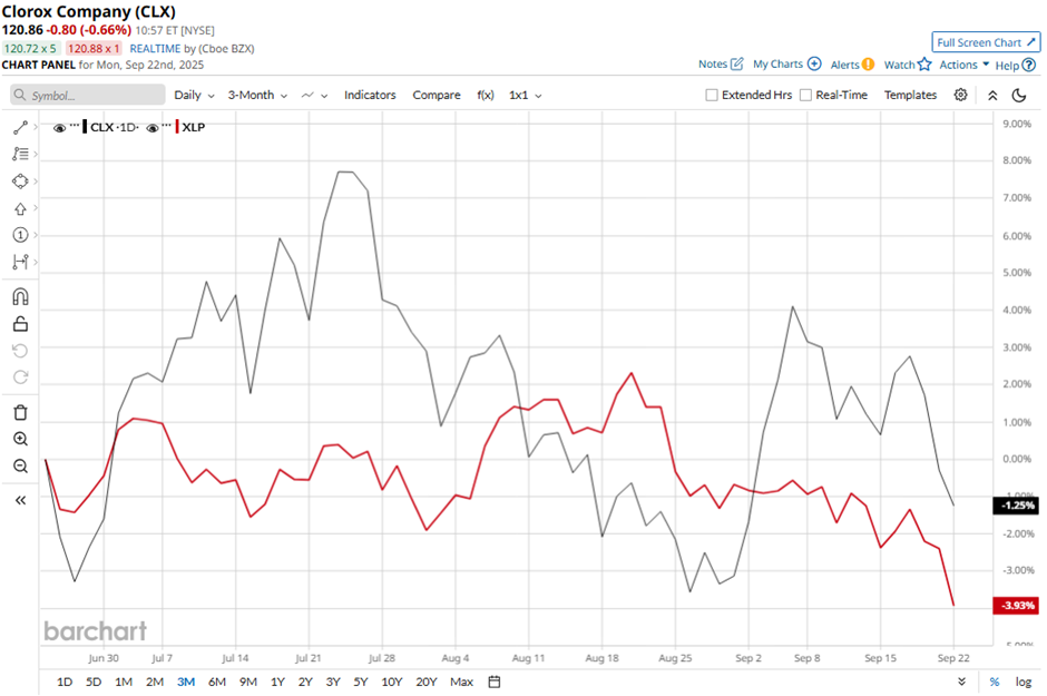 Shares of the Oakland, California-based company have pulled back 29.3% from its 52-week high of $171.37. CLX stock has risen marginally over the past three months, slightly outperforming the Consumer Staples Select Sector SPDR Fund’s (XLP) 3.3% decline over the same time frame.