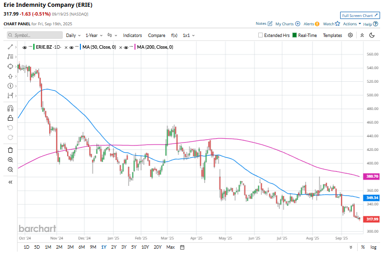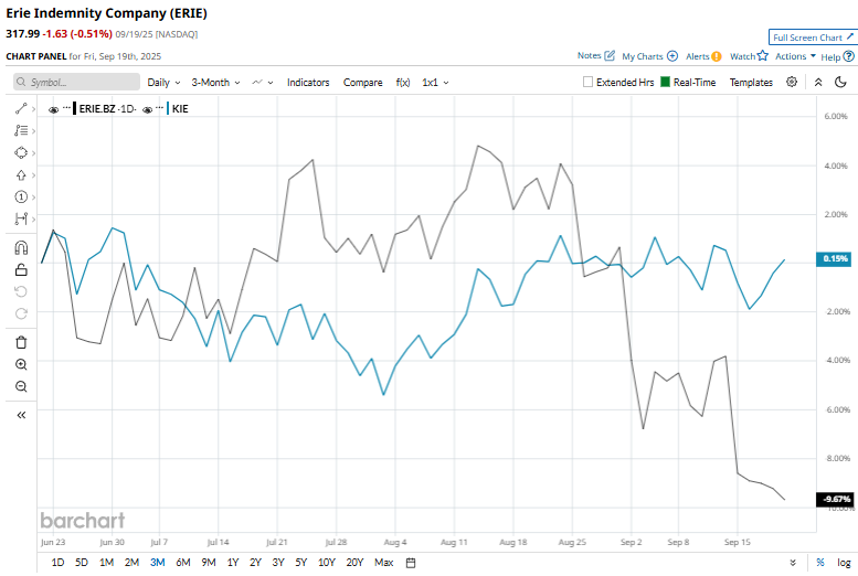 Shares of Erie Indemnity have retreated 41.9% from its 52-week high of $547. ERIE stock has dropped 8.8% over the past three months, lagging behind the SPDR S&P Insurance ETF (KIE), which has gained 1.2% over the same time frame.