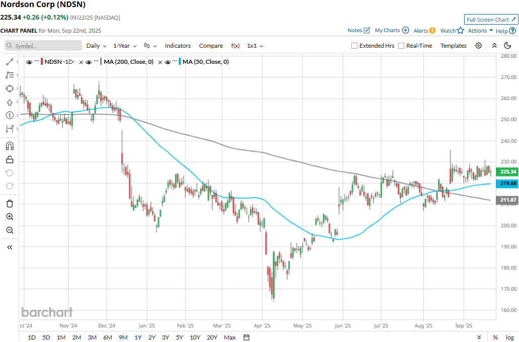 NDSN stock has remained mostly below its 200-day moving average over the past year, until August, and traded mostly above its 50-day moving average since early May with some fluctuations, underscoring its previous downturn and recent uptrend.