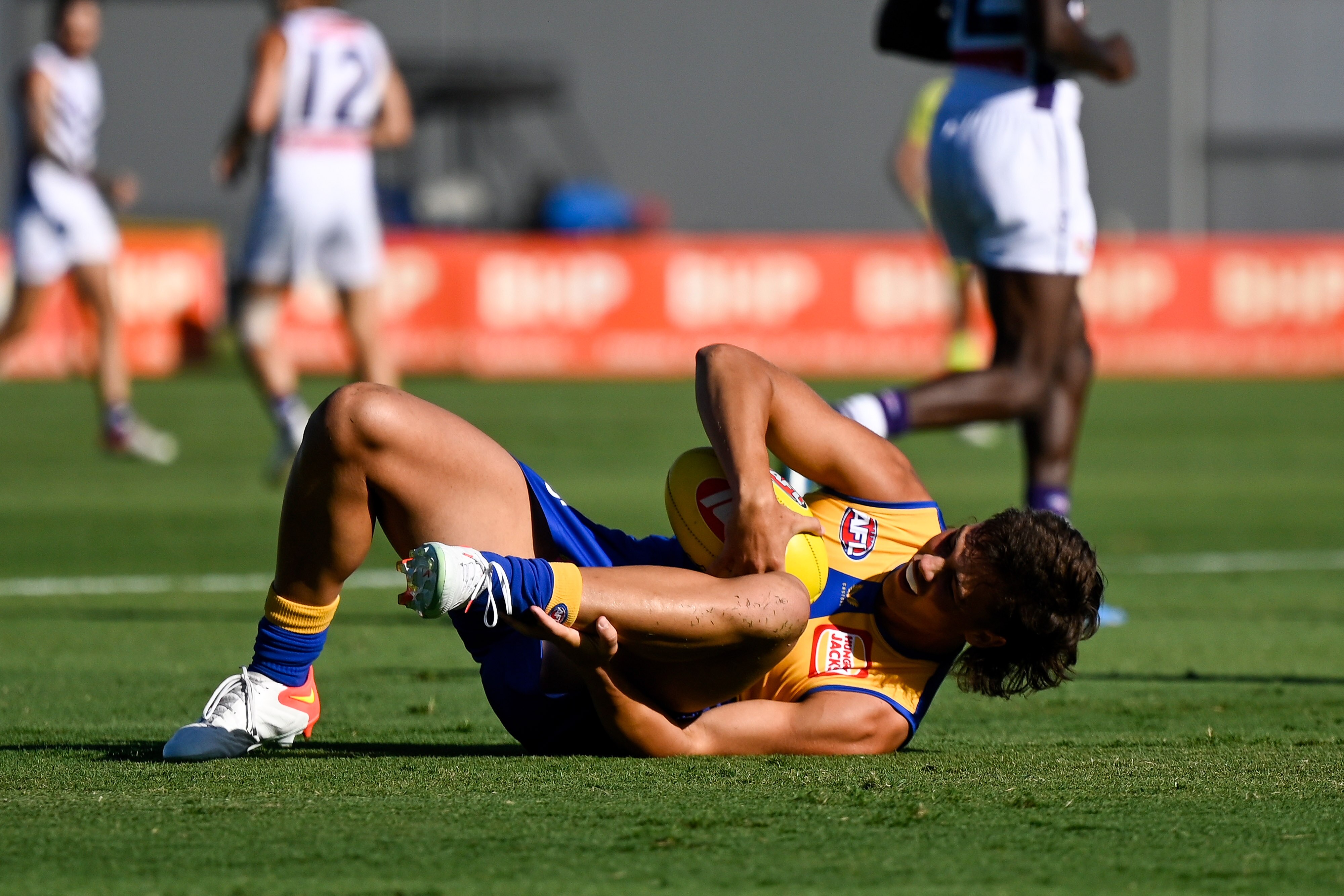 West Coast's Campbell Chesser injured his foot within five minutes of the game against Fremantle and looks set to miss several months. A cruel blow.