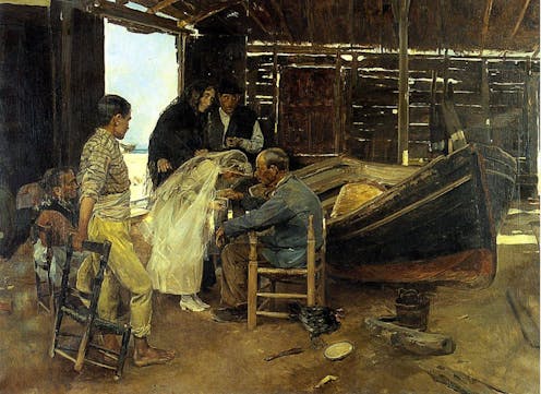He was probably inspired by the literature of his friend Vicente Blasco Ibañez, who in his novel Flor de Mayo (1895) had recounted the accident of a group of sailors at sea and the death of the youngest, Pascualet, on the Valencian beach of Cabañal.