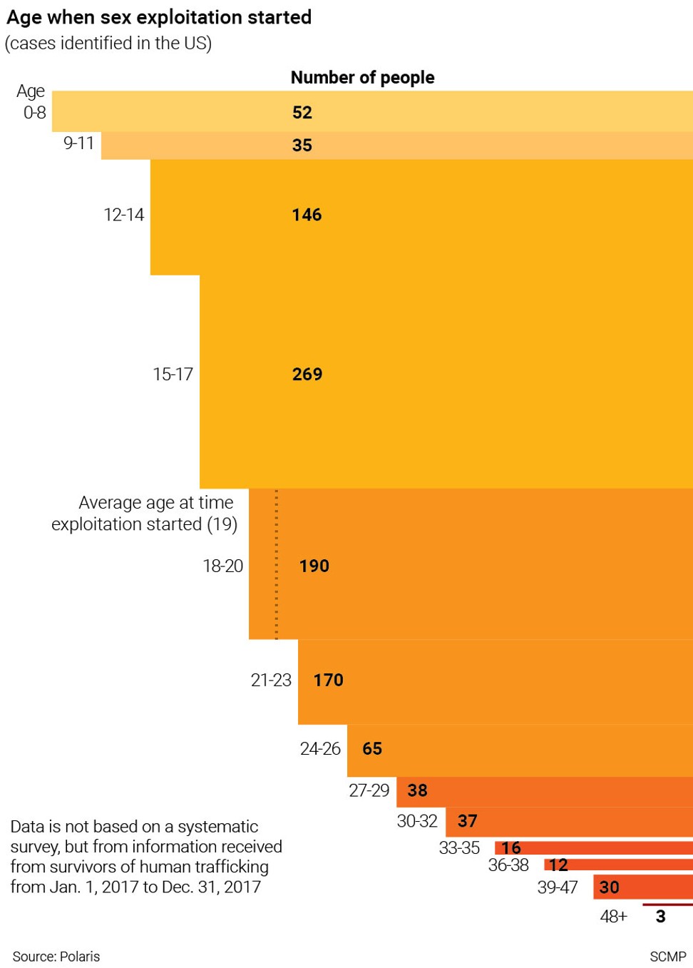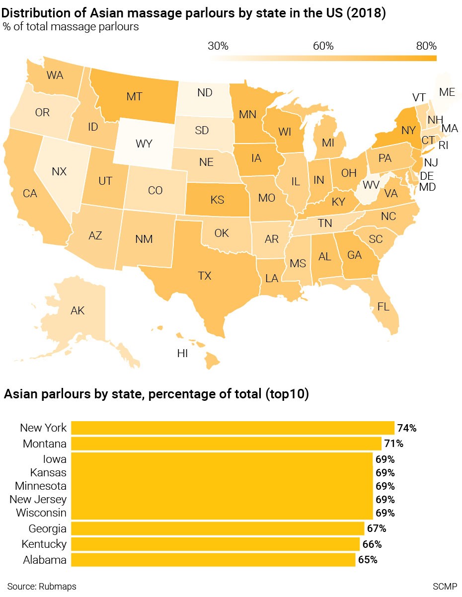 A recent study focusing only on illegal massage parlours estimated there were more than 9,000 such businesses in the US. The industry’s annual revenue was around US$2.5 billion, according to a report in January by Polaris. The non-profit group found that out of more than 32,000 cases of human trafficking between December 2007 and December 2016 – the largest data set on the topic ever analysed – massage parlours accounted for 2,949 cases, putting them second only to escort services as a source of the problem.