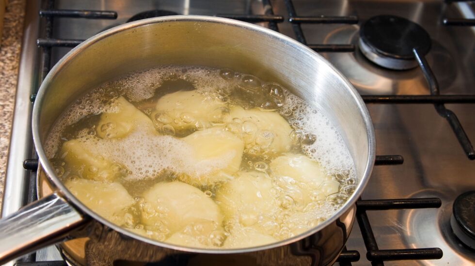 It is important to do everything you can to minimize the amount of water starchy potatoes absorb during boiling, so be very careful not to overcook them.
