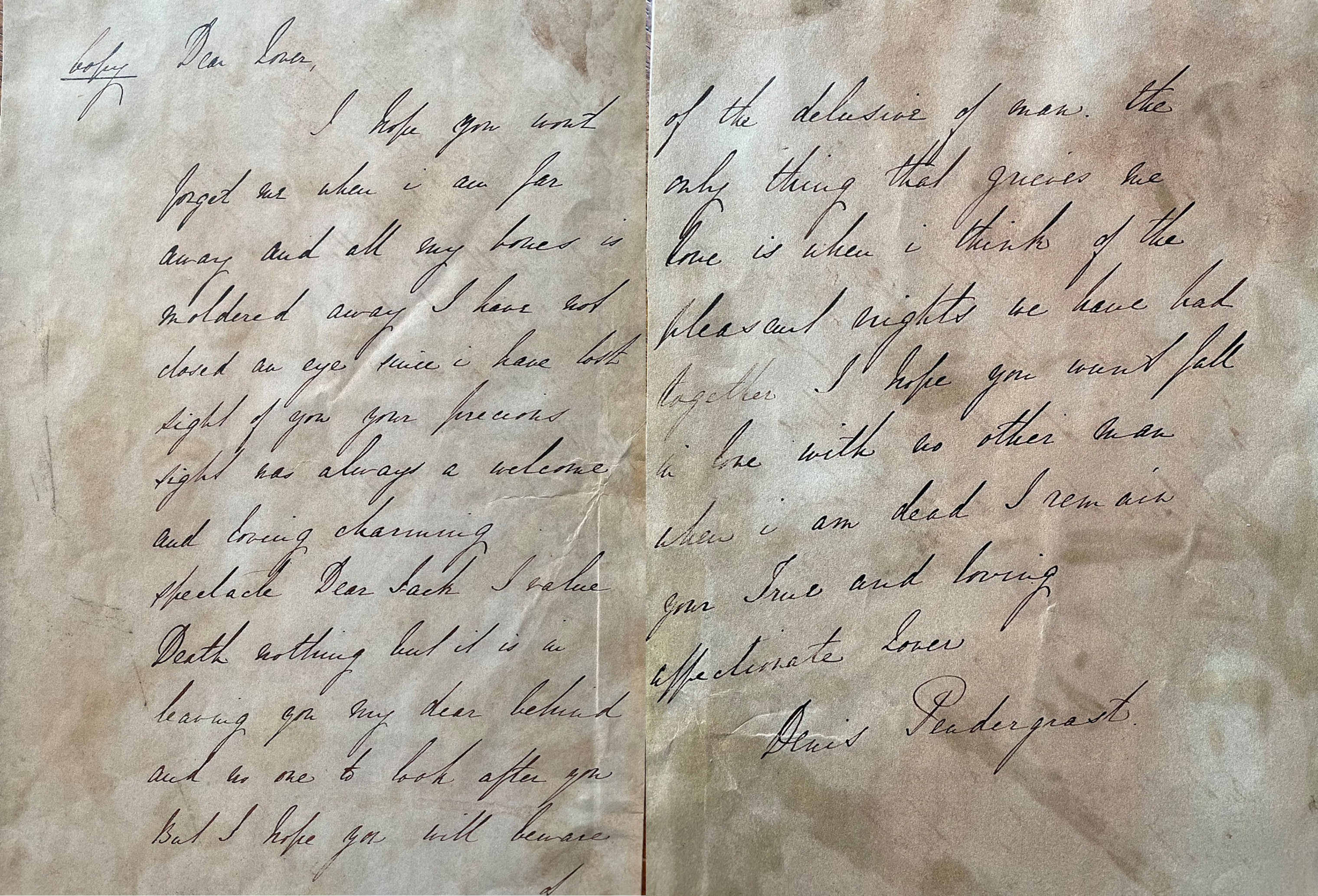 "I hope you wont forget me when I am far away and all my bones is moldered away I have not closed an eye since I lost sight of you your precious sight was always a welcome and loving charming spectacle. Dear Jack I value Death nothing but it is in leaving you my dear behind and no one to look after you ... The only thing that grieves me love is when I think of the pleasant nights we have had together. I hope you wont fall in love with no other man when I am dead and I remain your True and loving affectionate Lover"