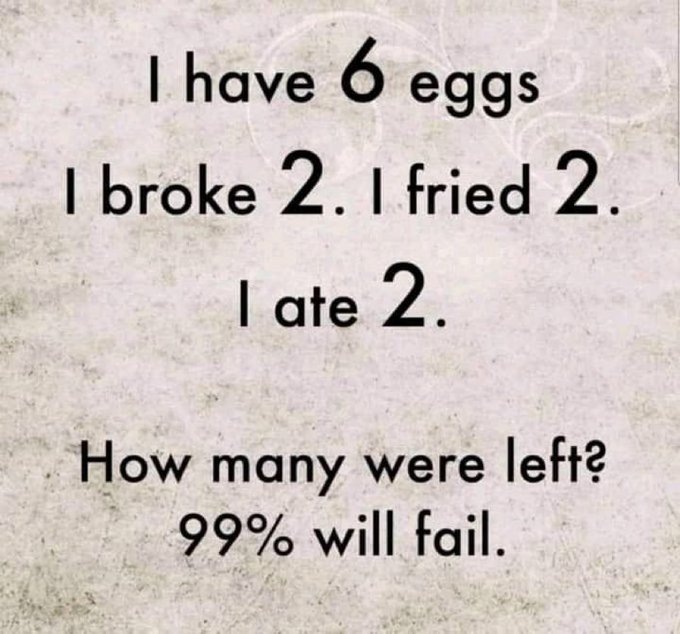 "I have 6 eggs. I broke 2. I fried 2. I ate 2. How many were left?," is the question which has more than 495k views on Twitter with over 1,600 likes and 400 retweets.