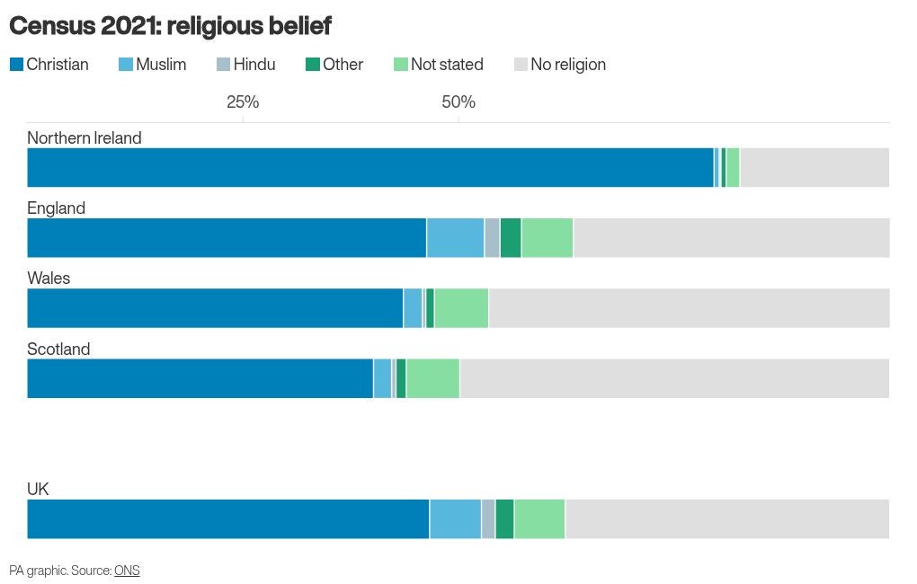 More than a third (37%) of people told the census they had no religion, while 7% identified as Muslim, 2% as Hindu, 2% identified with another religion and 6% did not give an answer.
