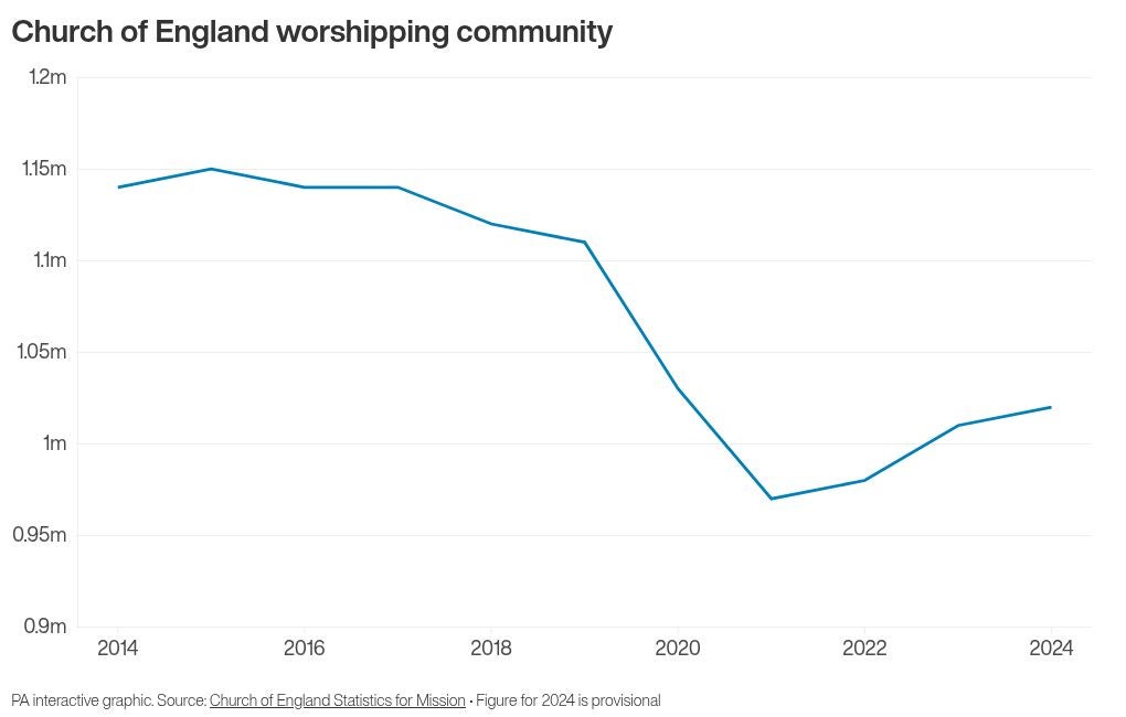 The new Archbishop of Canterbury will lead a Church of England that has seen congregations grow slightly in recent years, though numbers are still below pre-pandemic levels.