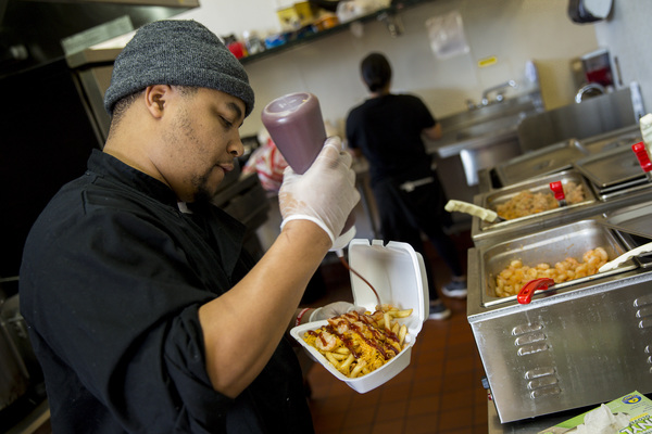 On a recent Tuesday, the 31-year-old Batiste is moving around his 5-by-5-foot restaurant kitchen, conducting an orchestra of three fryers, squeeze bottles of lemon garlic sauce and fistfuls of shredded cheddar cheese while a steady line of customers snakes from the register beyond the front door. In the month since the restaurant has opened, this little storefront has become one of the neighborhood's most popular lunch destinations.