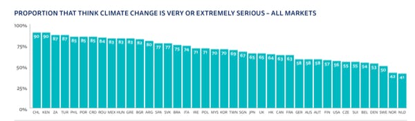 In our survey, across countries and markets, individuals who identify as left-wing tend to report higher levels of concern. This finding is even more visible in more polarised societies such as the US where 89% of those who self-identify on the left note that climate change is serious, compared to only 18% of those who self-identify on the right.