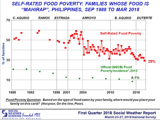 The 2018 first quarter results of the survey revealed that 42% (9.8 million) of families considered themselves poor, 2 percentage points below from last quarter. The survey also found that 29% (6.7 million) of families said they were eating food for the "poor", three percentage 3 points below from December 2017.