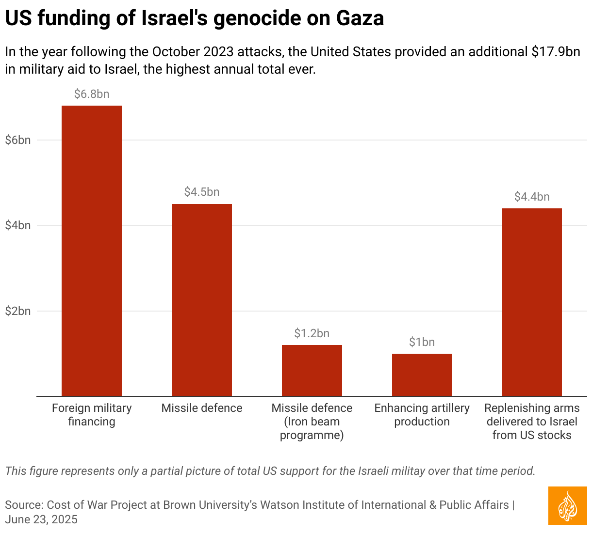 However, in the year following the October 2023 attacks, the US provided an additional $17.9bn in military aid to Israel, the highest annual total ever. This includes $6.8bn in military financing, $4.5bn for missile defence and $4.4bn on replenishing arms to Israel from US stocks.