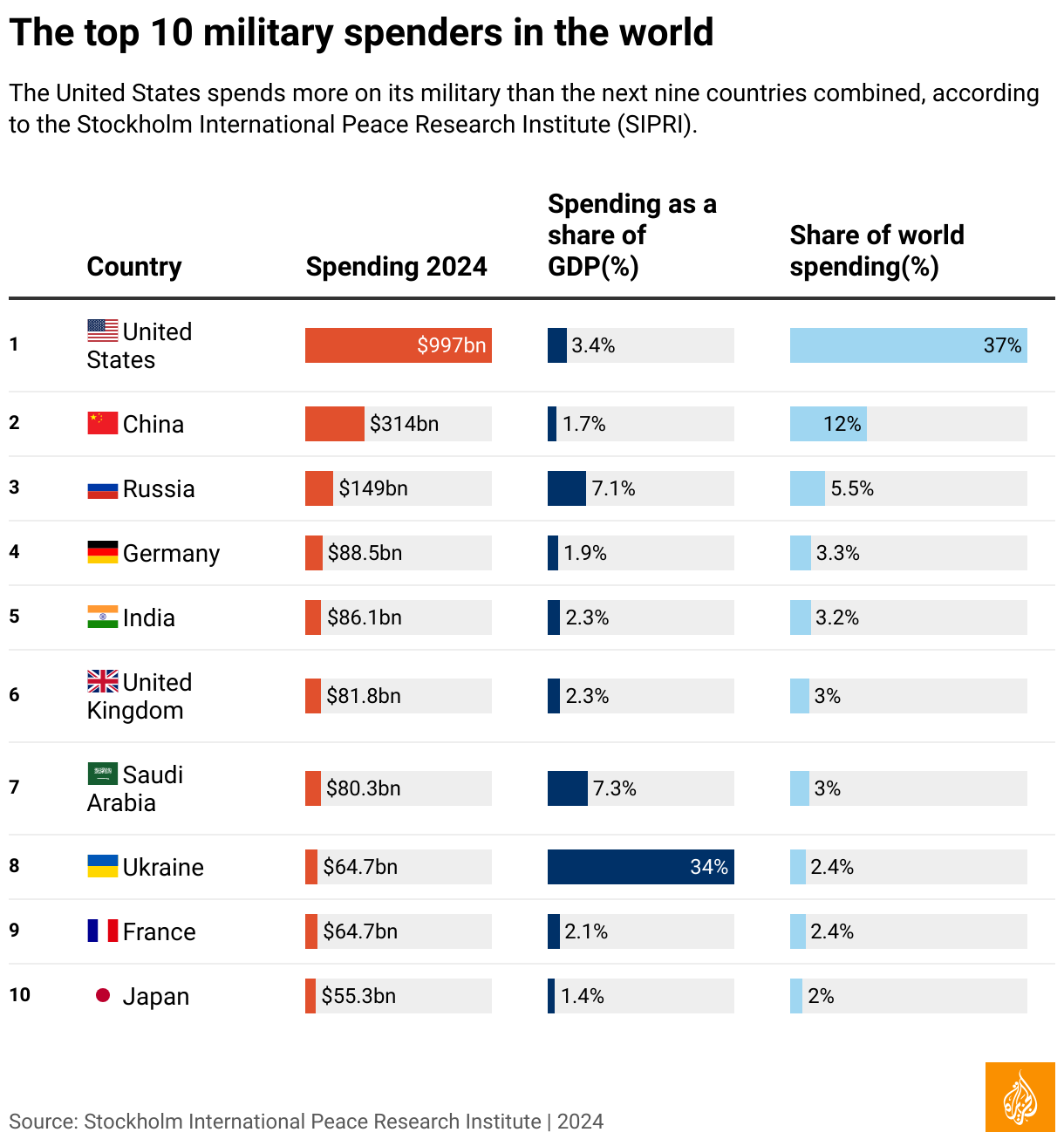 In 2024, the US spent $997bn on its military, accounting for 37 percent of all global military spending, according to the Stockholm International Peace Research Institute (SIPRI).