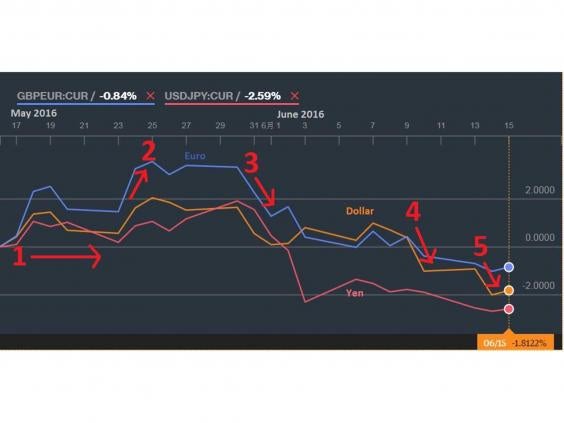 An OBR survey commissioned by the Independent showed that 55 per cent of votes were planning to vote Leave. This sent the pound tumbling to $1.426 against the dollar. The 1.4 per cent loss was the worst performance since February 22.