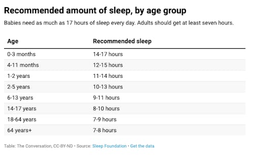 That’s why babies need 14 to 17 hours of sleep per day for the first three months of their lives — newborns are asleep way more than they are awake. Most school-aged kids need about 8 to 10 hours of sleep. Teens can aim for nine hours, which is what some adults need too. But seven or eight hours is enough for other grownups.
