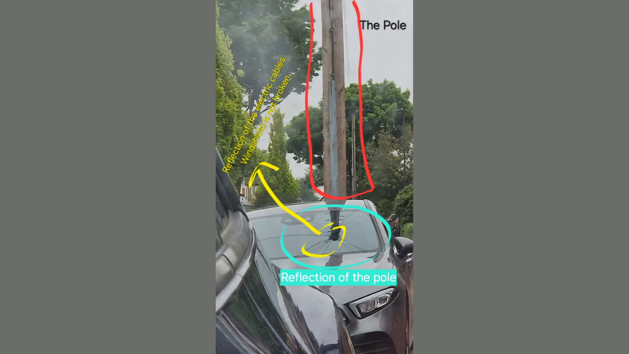 The pole is behind the car and what we see on the windshield is not a broken glass but the reflection of the pole. The wires on the pole appear to give a scratch alike illusion.