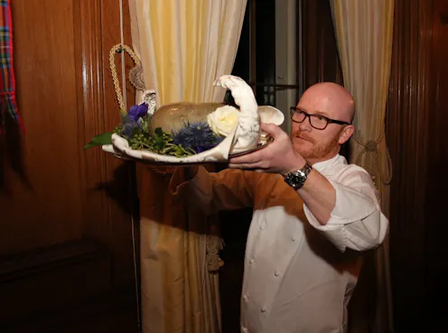 The Selkirk Grace — a short, evocative prayer written in the Scots vernacular —precedes the meal. Often it seems as if the haggis takes centre stage. The humble pudding is piped into the event, and all are treated to Burns’ whimsical “Address to a Haggis.”