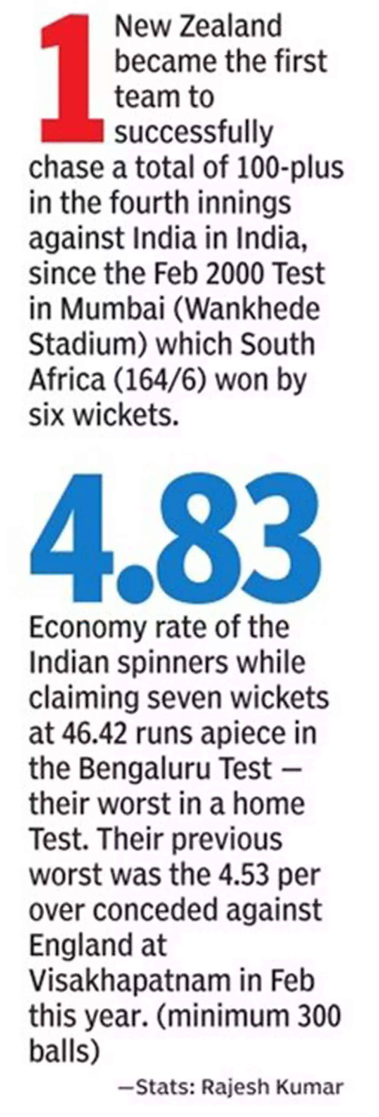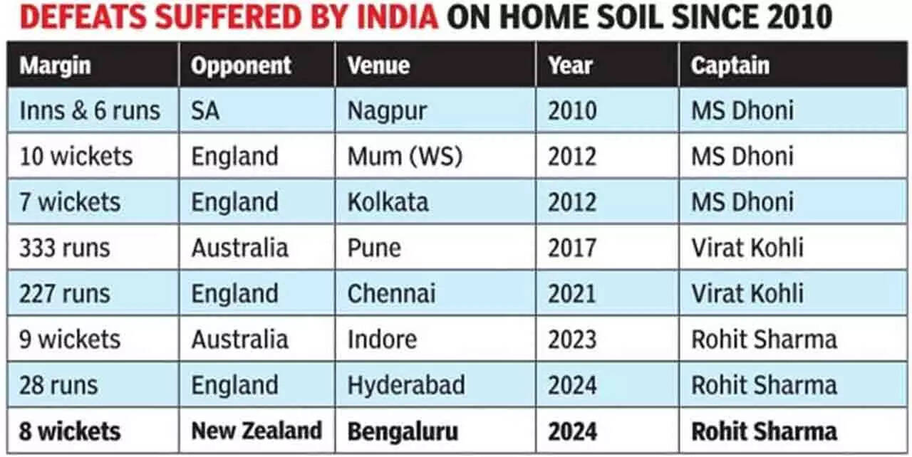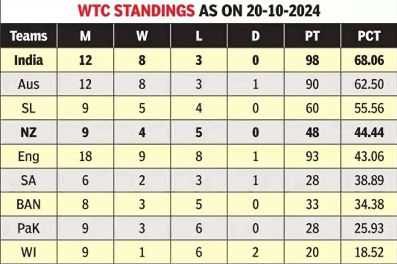 The loss did not alter India's position on top of the World Test Championship table (98 points; 68.06 PCT). It propelled New Zealand to the fourth position (48 pts; 44.44). With five Tests in hand in the current cycle, the Kiwis have some catching up to do.