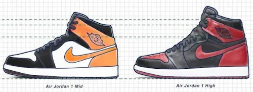 At first glance and to the untrained eye, the High and Mid are fraternal brothers. Though height is the main differentiator, the most noticeable is the tongue logo. OG Highs have the original “Nike Air” branding on the tongue while the Mids feature the Jumpman and “Air” below it. The former also has nine lace holes, while the latter has eight.