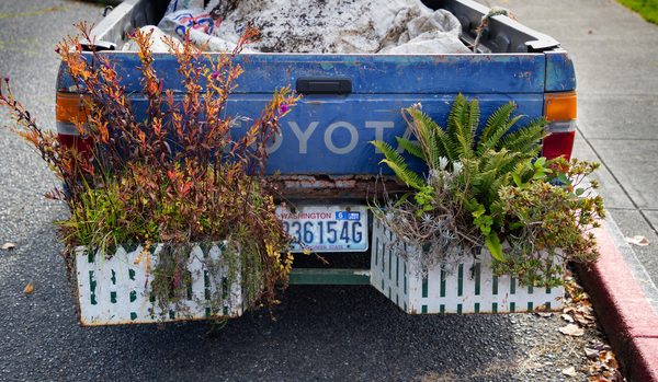 Peterson moved to Whidbey in 1989. She's been a freshwater biologist, a bicycle racer on the U.S. national team and a land caretaker. Her pickup truck has two plant beds attached to the back, her "bumper crop"; they're growing a mixture of native plants like fern, azalea, lavender and primrose, the boxes painted to resemble a white-picket fence.