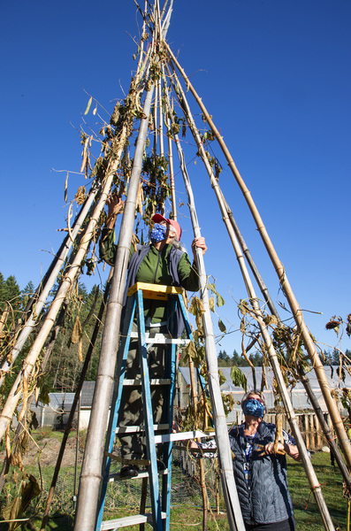 Under the watchful eyes of their teacher Jean Cravy and school farm manager Cary Peterson, the South Whidbey School District students dismantled the big structure one piece at a time, not long after a late October frost rendered the long, thin fortex bean pods swollen, inedible — but still compostable.