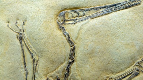 But pterosaurs primarily had one finger to support their wings. Their main wing was composed of a single giant “spar” – a structural unit – made of up of the bones of the arm and the greatly elongated fourth finger, with a membrane that stretched from the tip of the finger down to the ankle. This membrane acted as a flight surface.