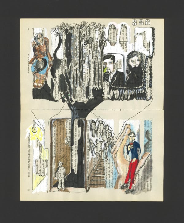 It was Sigmund Freud who first traced the links between dreams and memory, so Lockheart paints on to pages torn (with publisher’s permission) from Freud’s book The Interpretation of Dreams. Since the COVID-19 pandemic lockdown, we are doing this online with healthcare and key workers. This enables live participation from around the world.