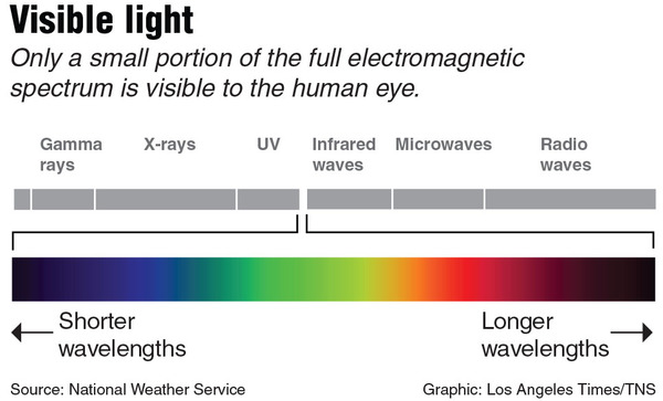 Only a small portion of the full electromagnetic spectrum is visible to the human eye. There are seven colors in the visible spectrum: red, orange, yellow, green, blue, indigo and violet.